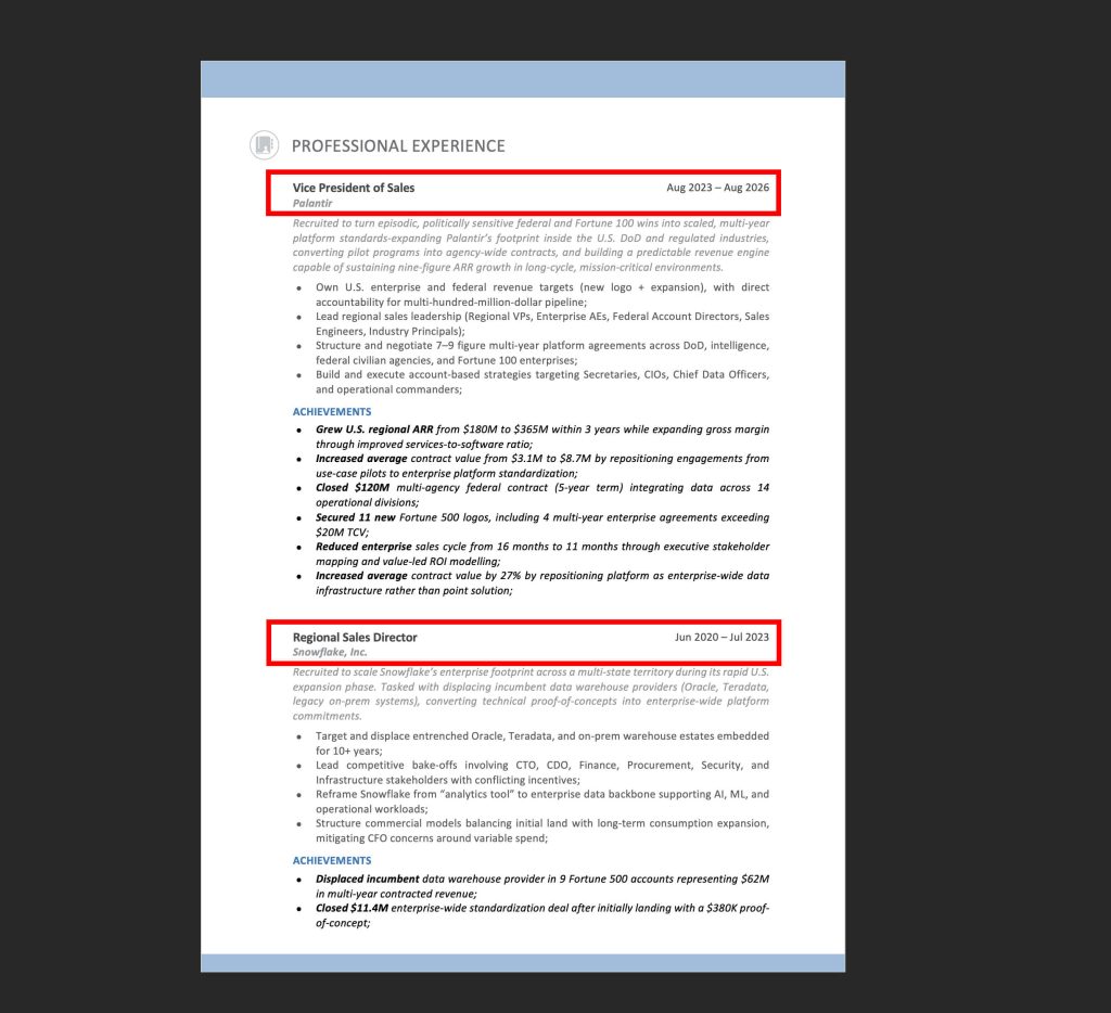 - Provides an at-a-glance overview of your career trajectory. Recruiters are looking for evidence of expanding scope and high promotion velocity.