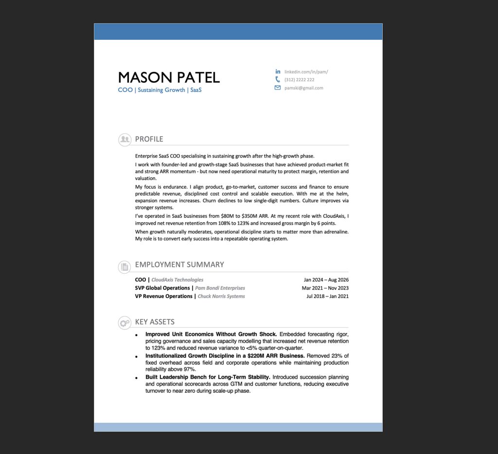 A COO’s resume must be a masterclass in efficient communication. Stick to the following sections, in this order:
