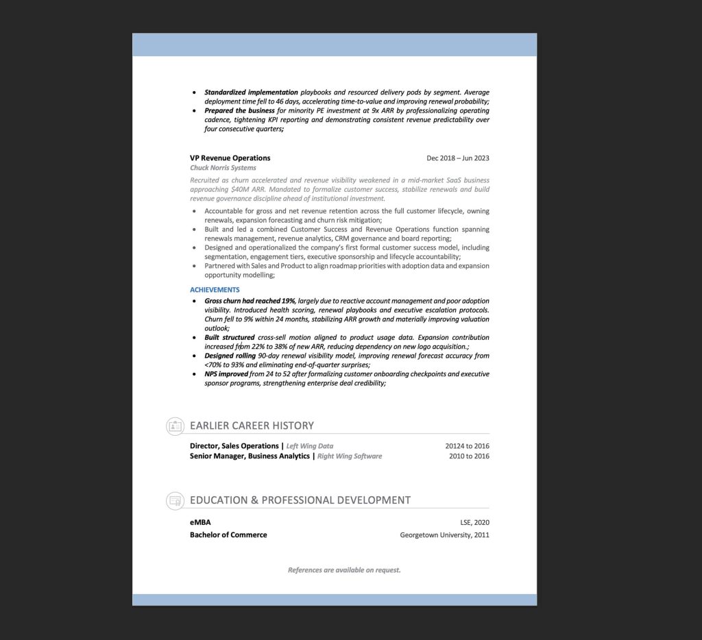 Above: Page 3 of a COO’s resume. It contains Education and Earlier Career History sections, as well as spillover from the Professional Experience section.