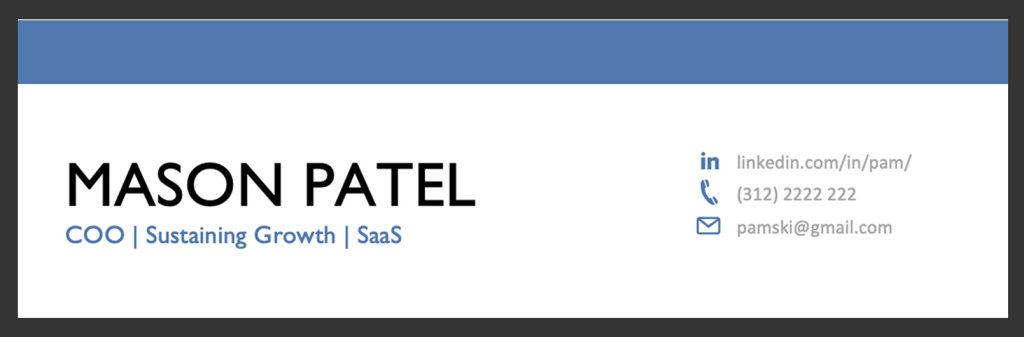 The header of your COO resume will contain your contact details (phone, email and LinkedIn profile URL) as well as your headline.