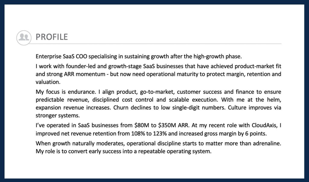Above: The profile of this SaaS COO makes it abundantly clear what value he delivers, and to whom.