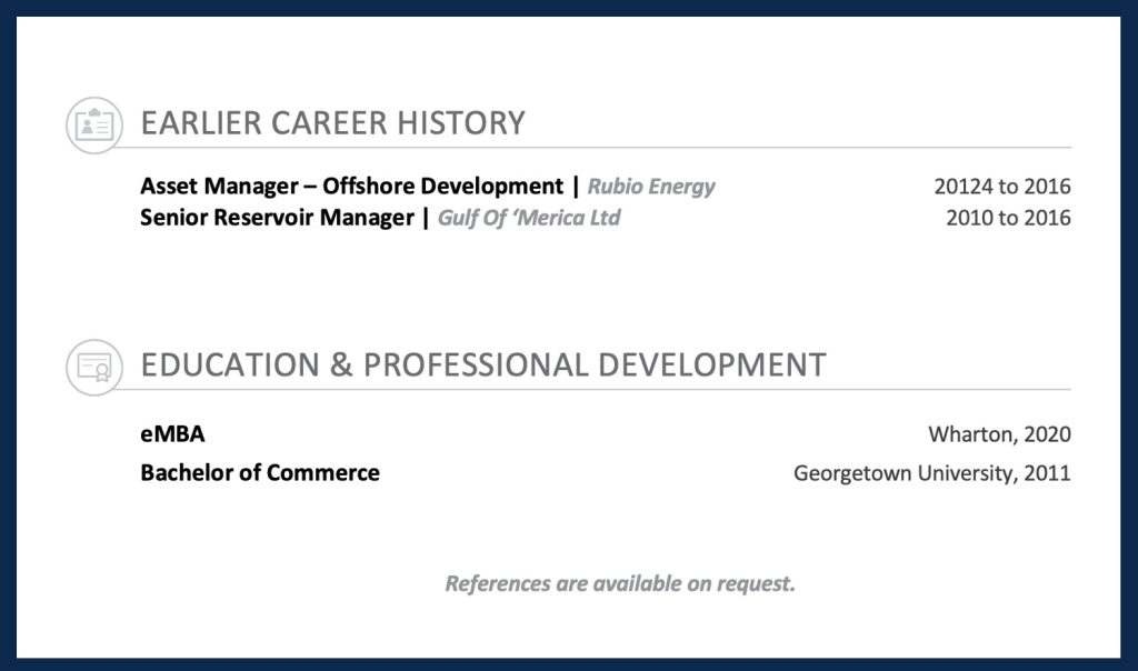 Above: This is how you wrap up your COO resume. Earlier Career History, Education and a pithy note about references.