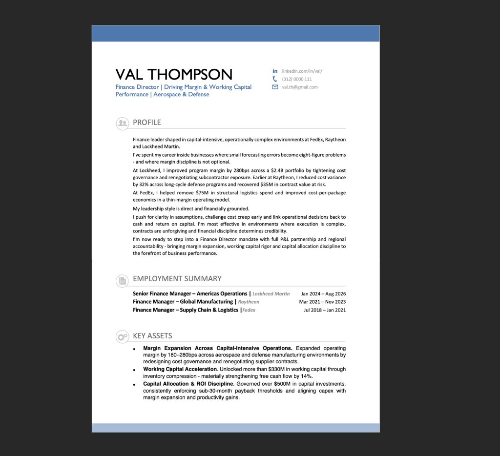 Above: The front page of a Finance Director’s resume. Notice the elevated, confident, but friendly design. Your eye instinctively recognises that this is a premium document.