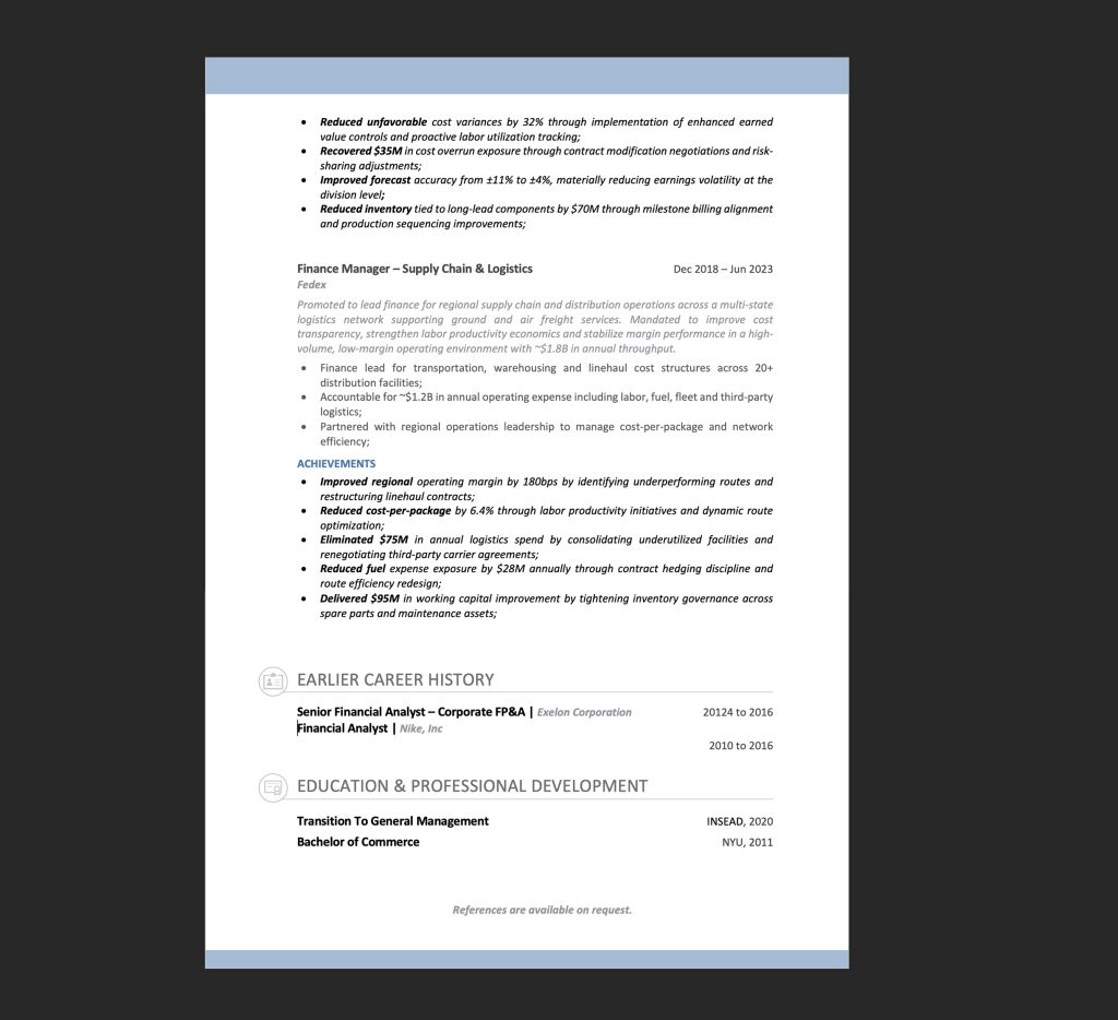 Above: Wrap up your Finance Director resume by listing your degrees and earlier roles. Also, let the reader know that references are available.