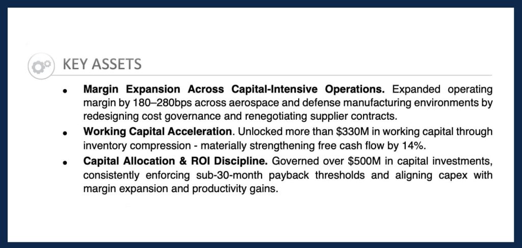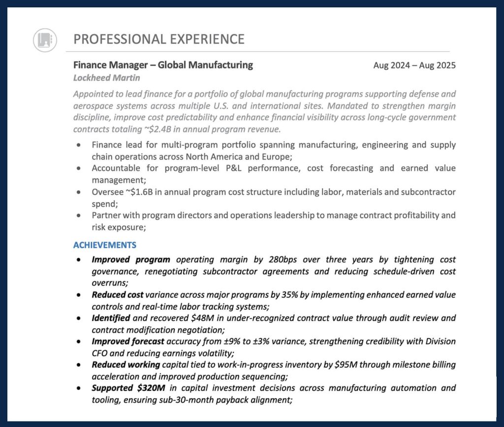A strong finance executive resume uses both words and numbers to convey your unique value. Words set the scene – while metrics quantify the impact.