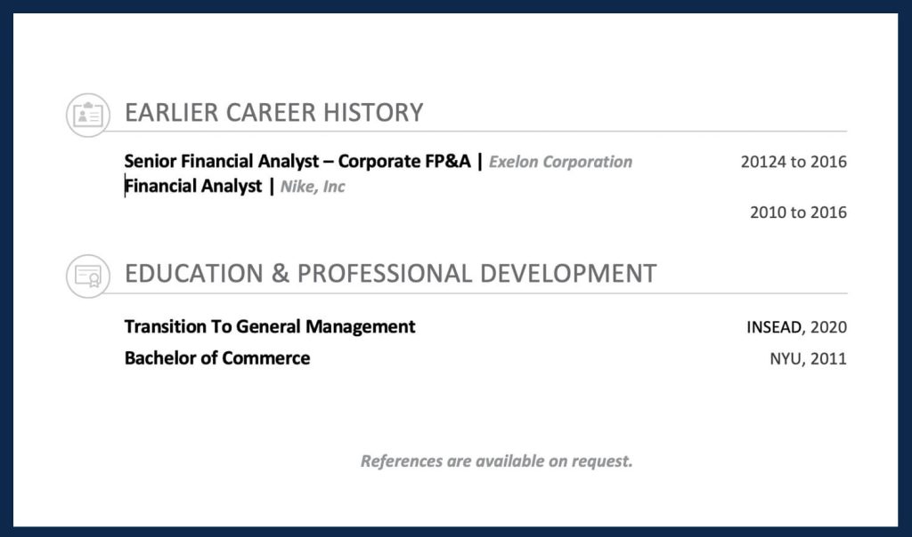 As I mentioned earlier, you can include an optional “Earlier Career Section” to succinctly list leadership roles that you held more than 15 years ago. But only if they’re commercially relevant.