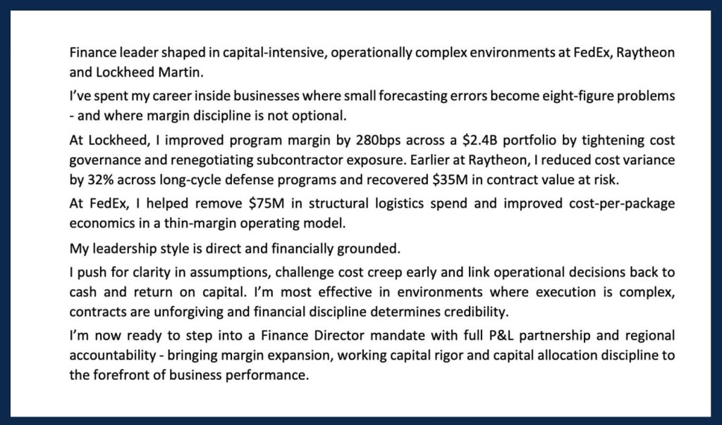 Above: The profile of this Finance Director tells a clear career story – and offers tangible differentiators.