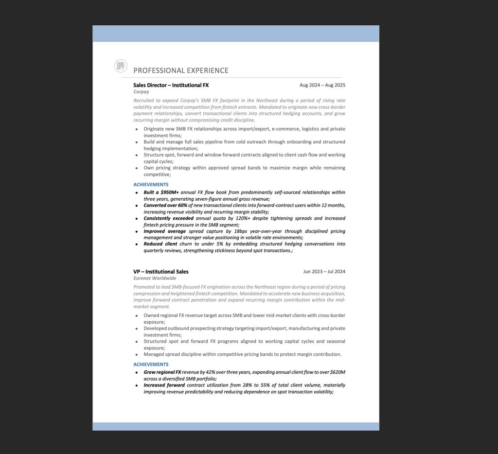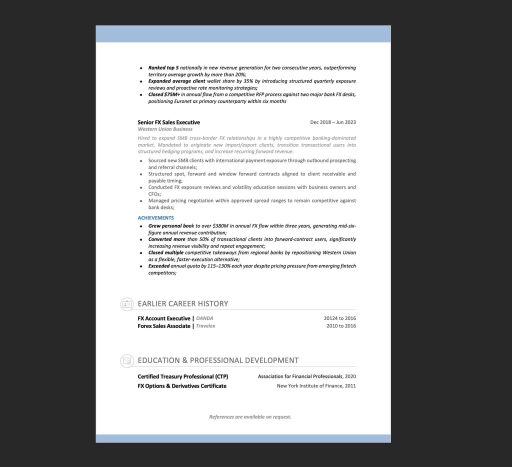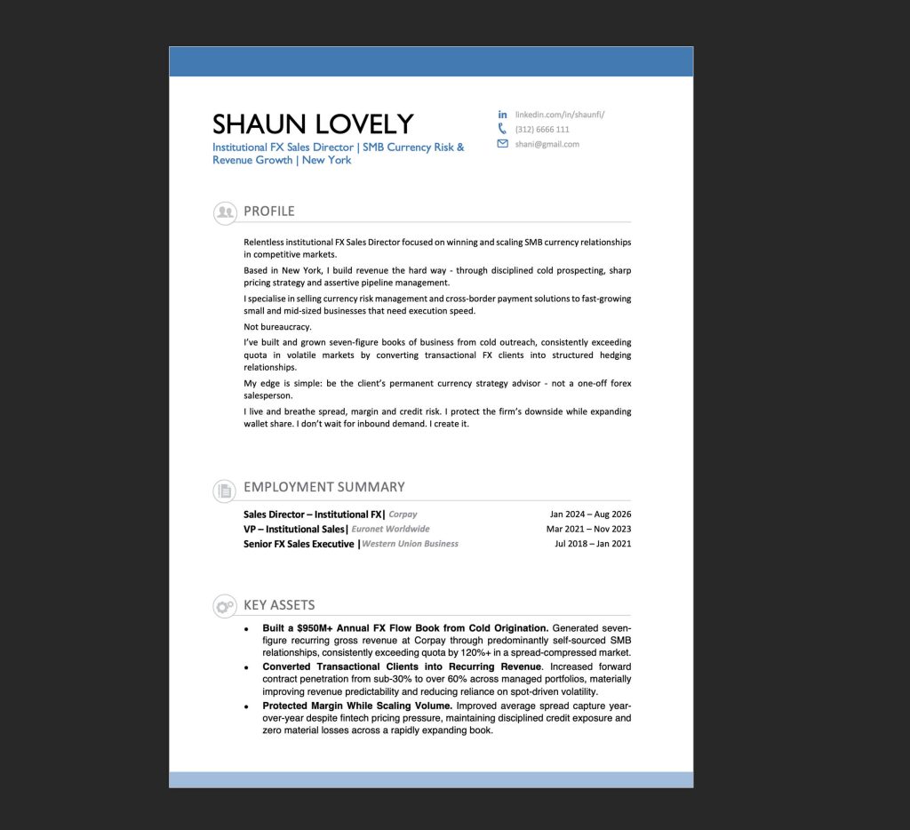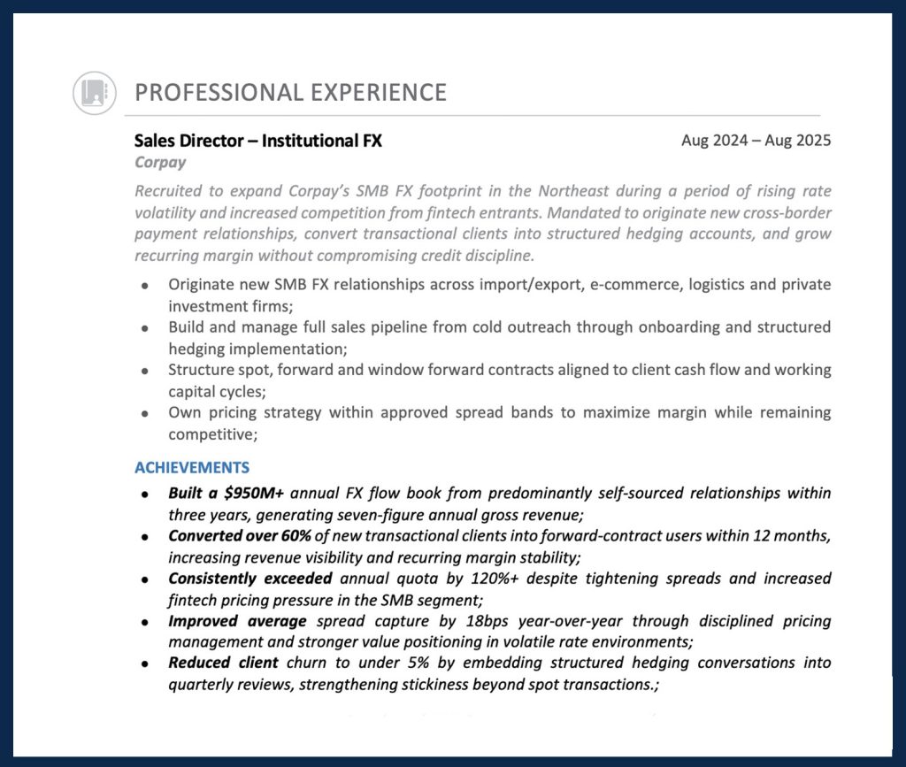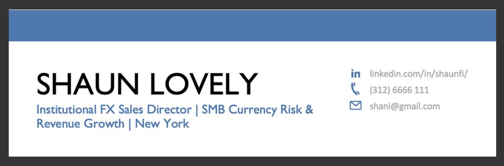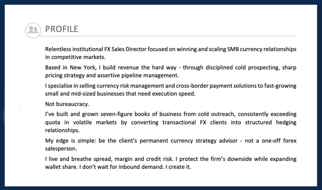 Above: Example of a headline that positions this Sales Director as a unique answer to a specific business problem. If I need a forex sales leader who specialises in NYC SMBs, I’m calling this guy.