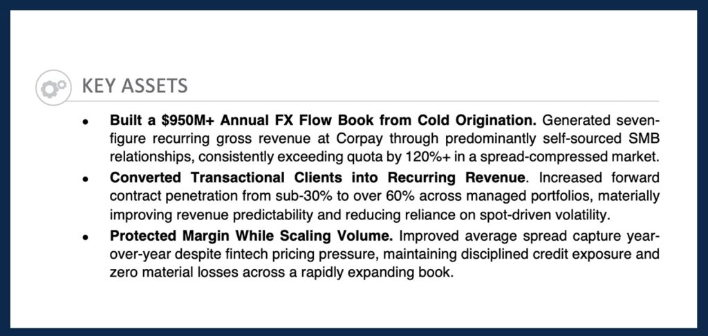 - Spotlight 3-4 of your most relevant, high-impact achievements. They can mirror the highlights from your “Key Assets” section.