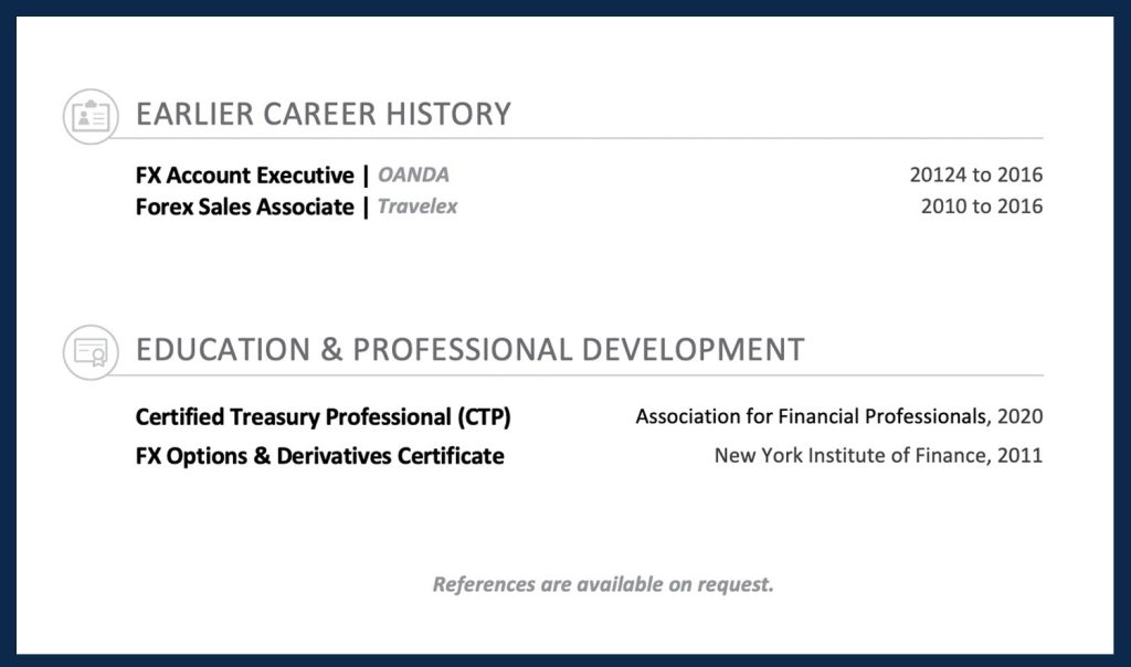Optionally, add an “Earlier Career Section” that lists roles that are somewhat relevant to your application. For example, sales roles that you held more than 15 years ago.