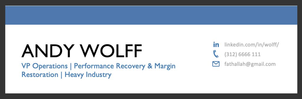 The header’s primary purpose is to convey your contact information (phone, email and LinkedIn profile URL).