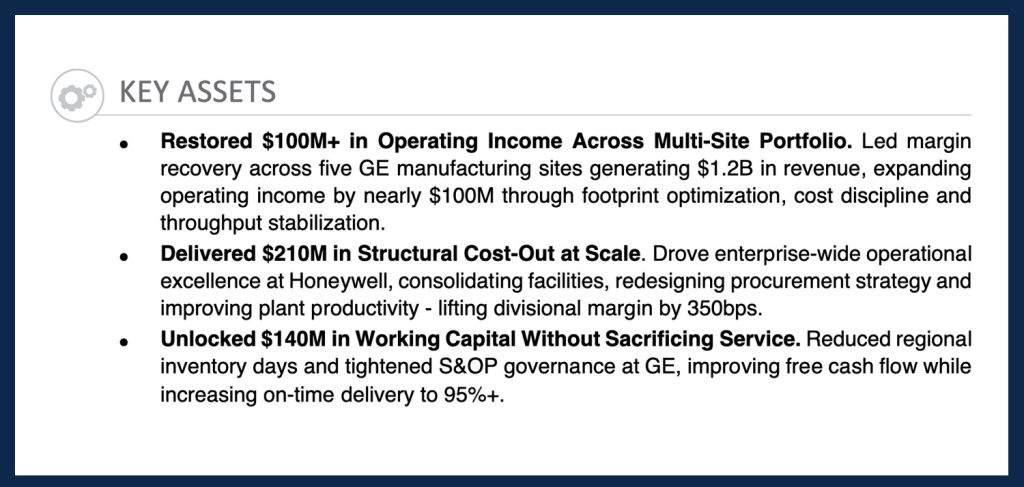 Living at the bottom of page one, the “Key Assets” section spotlights the most significant wins of your leadership career.