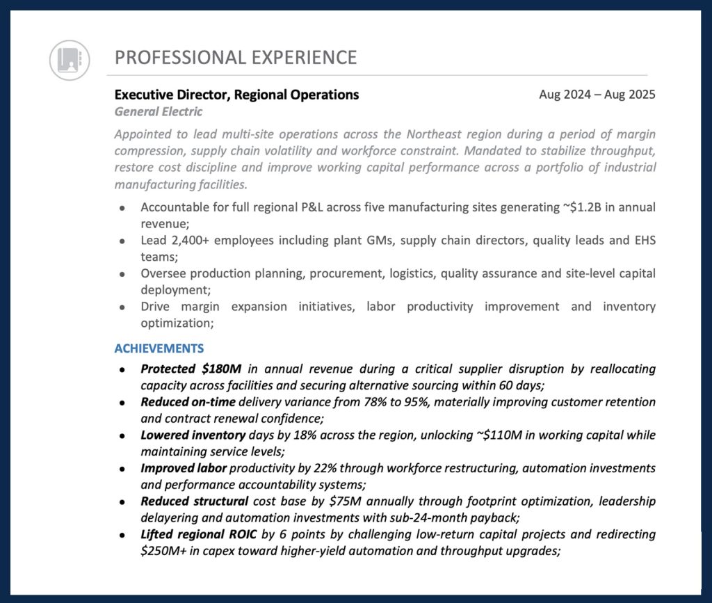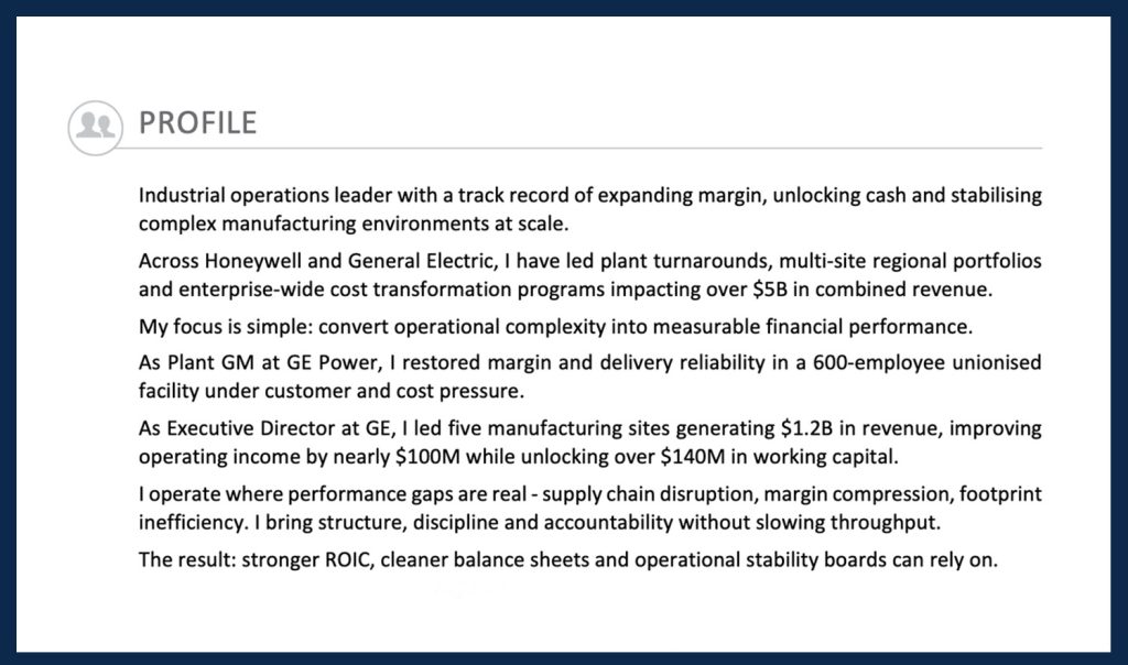 Above: The profile of this VP of Operations makes it clear what value he delivers, and to which sector. Quantified achievements serve as proof.