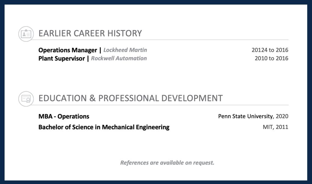 And, as I mentioned earlier, you can pop in an optional “Earlier Career Section” to succinctly list leadership roles that you held more than 15 years ago.