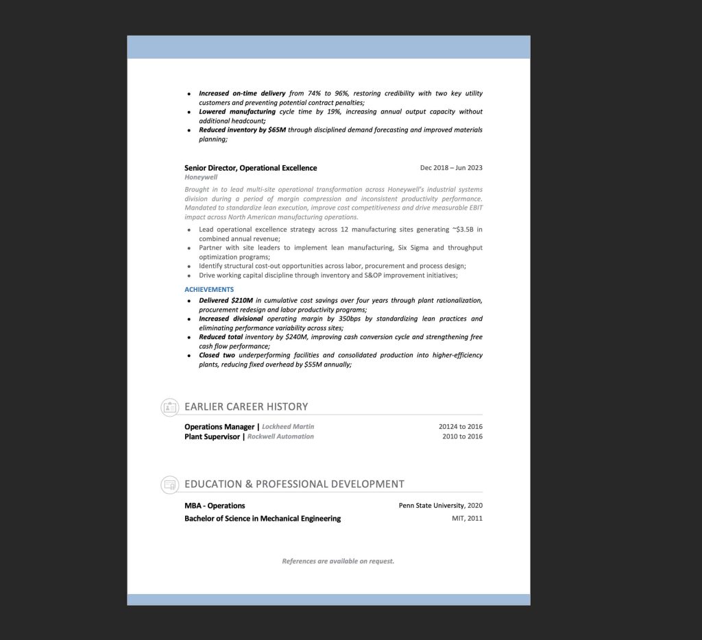Above: Page 3 of a Vice-President’s resume. It contains Education and Earlier Career History sections, as well as spillover from the Professional Experience section.